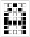 Each character is represented by a 5×7 grid of pixels. We use the graphical printing characters of the IBM extended ASCII character set to show a grayscale output for each pixel. To represent the letter A, for example, you could use the pattern shown in Figure 12.1. Here the blackened boxes represent value 1, while empty boxes represent a zero. You can represent all characters this way, with a binary map of 35 pixel values.